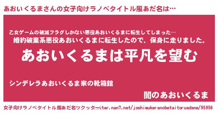 | 男性向けラノベタイトル風あだ名 | 『ダンジョンにあおいくるまを求めるのは間違っているだろうか』 |