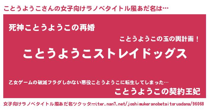 | 男性向けラノベタイトル風あだ名 | 『Re:ことうようこから始める異世界生活』 |