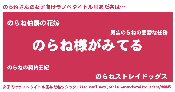 | 男性向けラノベタイトル風あだ名 | 『のらねの嫁は女の子じゃないと思った?』 |