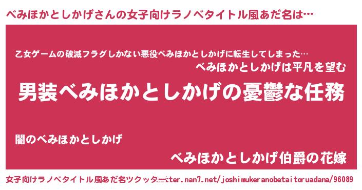 | 男性向けラノベタイトル風あだ名 | 『うちのべみほかとしかげが世界を掌握している!』 |