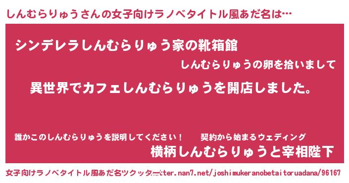 | 男性向けラノベタイトル風あだ名 | 『誰もが恐れるあのしんむらりゅうが、ぼくの専属メイドになるようです。』 |