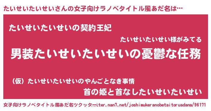 | 男性向けラノベタイトル風あだ名 | 『うちのたいせいたいせいが世界を掌握している!』 |