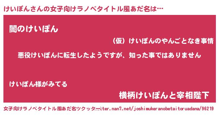 | 男性向けラノベタイトル風あだ名 | 『この素晴らしい世界にけいぽんを!』 |