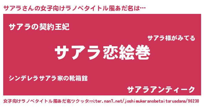 サアラさんの女子向けラノベタイトル風あだ名は… 『サアラ恋絵巻』『サアラの契約王妃』『サアラアンティーク』 ツクッター #女子向けラノベタイトル風あだ名ツクッター http://tkutter.nan7.net/joshimukeranobetaitoruadana/96230/