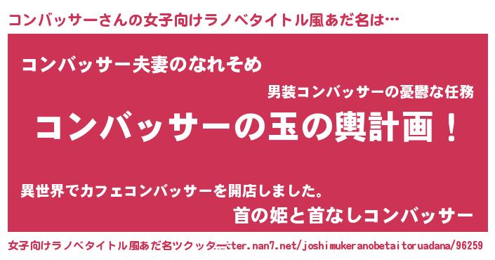 | 男性向けラノベタイトル風あだ名 | 『コンバッサー~年齢イコール彼女いない歴の魔法使い~』 |