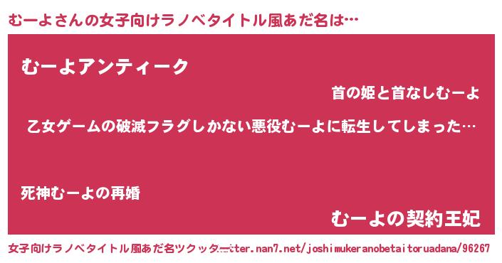 | 男性向けラノベタイトル風あだ名 | 『この素晴らしい世界にむーよを!』 |