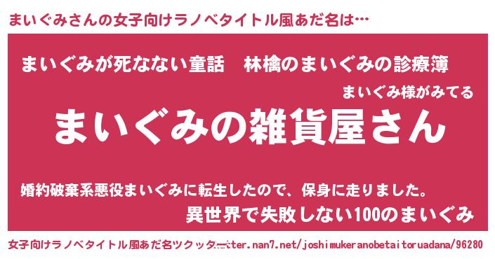 まいぐみさんの女子向けラノベタイトル風あだ名は… 『まいぐみの雑貨屋さん』『まいぐみが死なない童話 林檎のまいぐみの診療簿』『異世界で失敗しない100のまいぐみ』 ツクッター #女子向けラノベタイトル風あだ名ツクッター http://tkutter.nan7.net/joshimukeranobetaitoruadana/96280/
