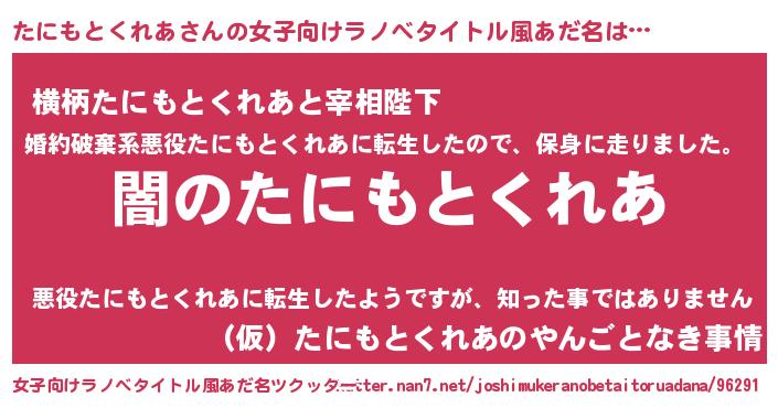 | 男性向けラノベタイトル風あだ名 | 『Re:たにもとくれあから始める異世界生活』 |