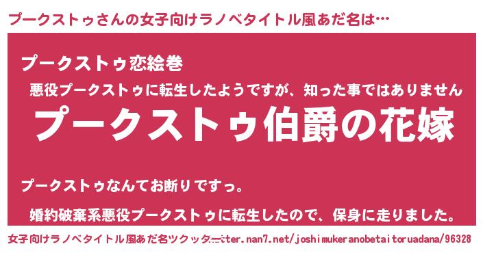 | 男性向けラノベタイトル風あだ名 | 『やはりプークストゥの青春ラブコメはまちがっている 』 |