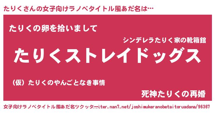 | 男性向けラノベタイトル風あだ名 | 『Re:たりくから始める異世界生活』 |
