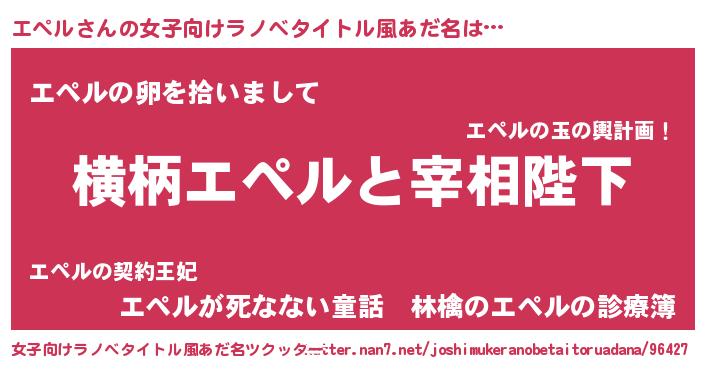 エペルさんの女子向けラノベタイトル風あだ名は… 『横柄エペルと宰相陛下』『エペルの卵を拾いまして』『エペルが死なない童話 林檎のエペルの診療簿』 ツクッター #女子向けラノベタイトル風あだ名ツクッター http://tkutter.nan7.net/joshimukeranobetaitoruadana/96427/