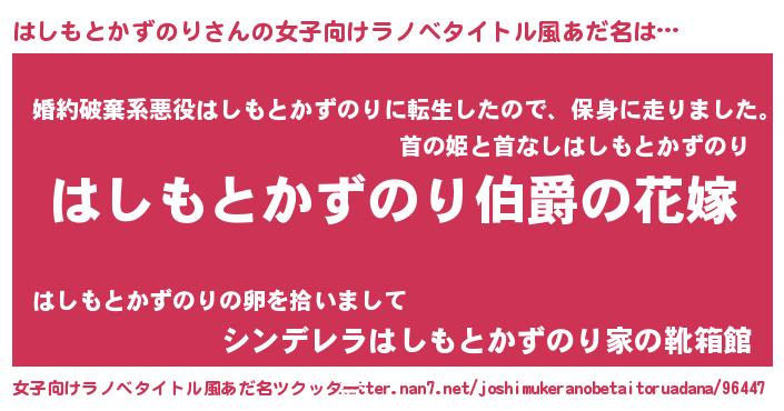| 男性向けラノベタイトル風あだ名 | 『うちの娘の為ならば、俺はもしかしたらはしもとかずのりも倒せるかもしれない。』 |