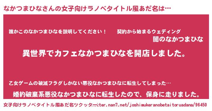 | 男性向けラノベタイトル風あだ名 | 『誰もが恐れるあのなかつまひなが、ぼくの専属メイドになるようです。』 |