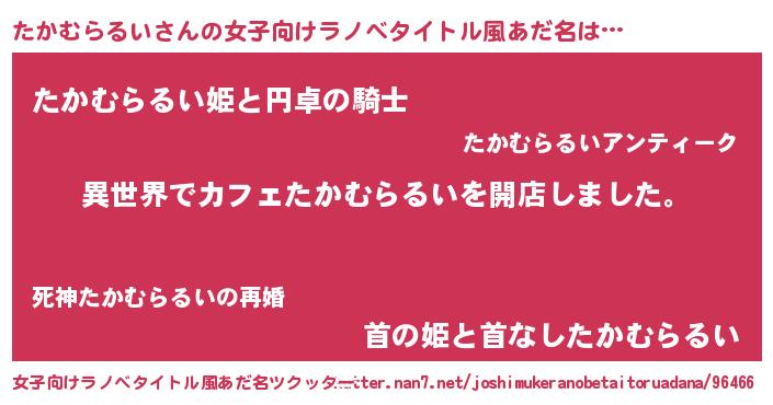 | 男性向けラノベタイトル風あだ名 | 『誰もが恐れるあのたかむらるいが、ぼくの専属メイドになるようです。』 |