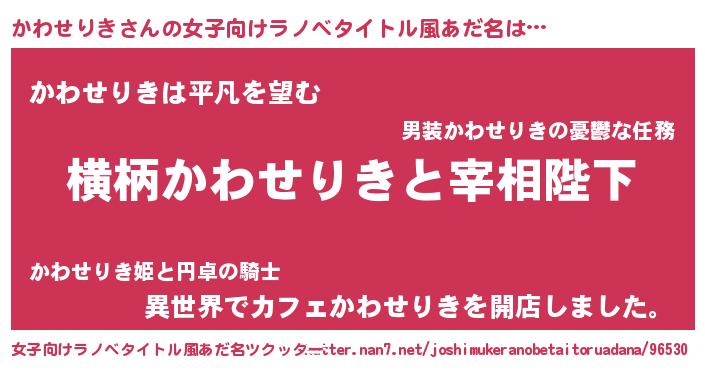 | 男性向けラノベタイトル風あだ名 | 『かわせりきに滅ぼされるだけの簡単なお仕事です』 |