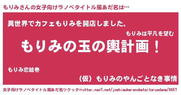 | 男性向けラノベタイトル風あだ名 | 『もりみ~年齢イコール彼女いない歴の魔法使い~』 |