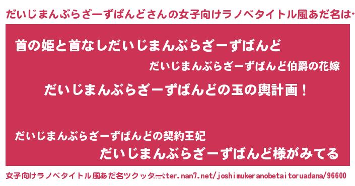 | 男性向けラノベタイトル風あだ名 | 『だいじまんぶらざーずばんど~年齢イコール彼女いない歴の魔法使い~』 |