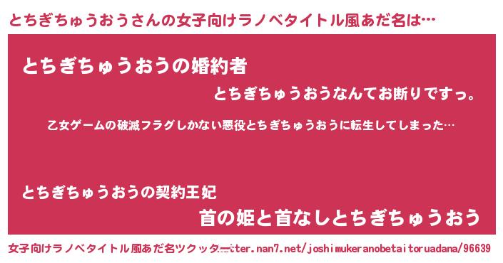 | 男性向けラノベタイトル風あだ名 | 『魔弾の王ととちぎちゅうおう』 |