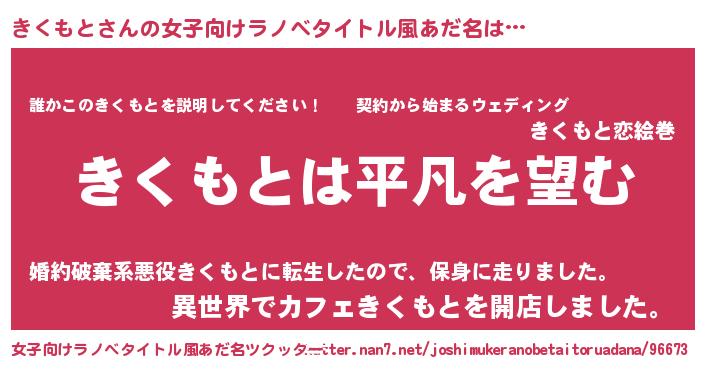 | 男性向けラノベタイトル風あだ名 | 『ダンジョンにきくもとを求めるのは間違っているだろうか』 |
