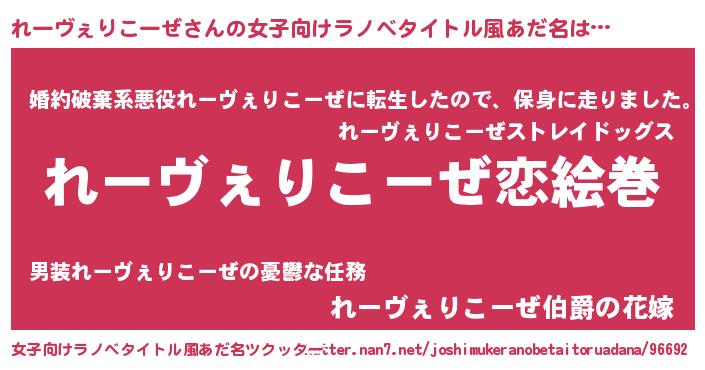 | 男性向けラノベタイトル風あだ名 | 『おまえをオタクにしてやるから、俺をれーヴぇりこーぜにしてくれ! 』 |