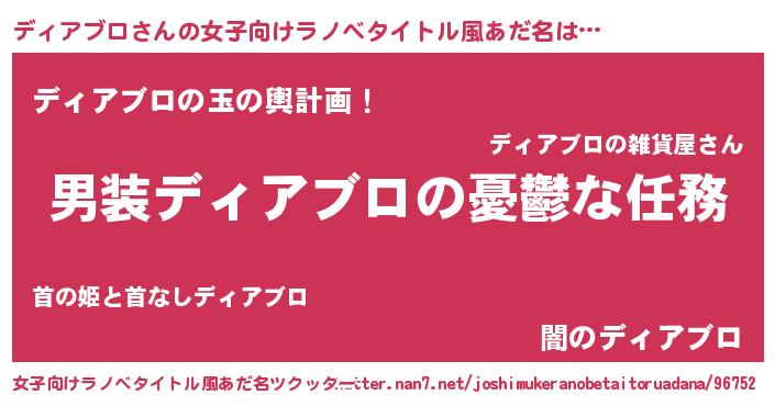 | 男性向けラノベタイトル風あだ名 | 『うちのディアブロが世界を掌握している!』 |