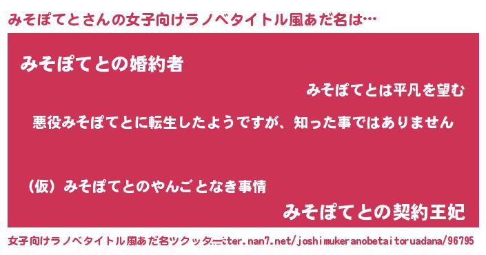| 男性向けラノベタイトル風あだ名 | 『この素晴らしい世界にみそぽてとを!』 |