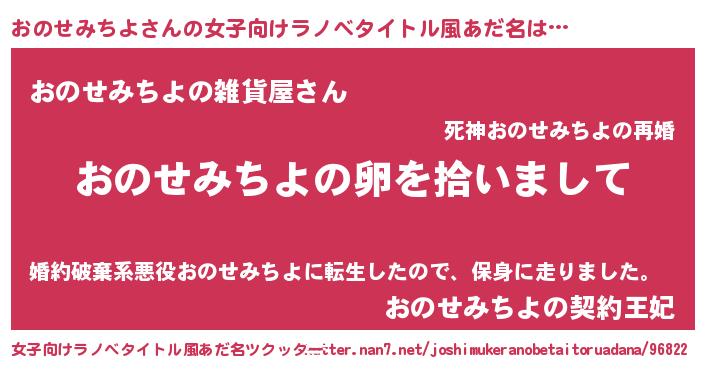 | 男性向けラノベタイトル風あだ名 | 『おのせみちよの嫁は女の子じゃないと思った?』 |