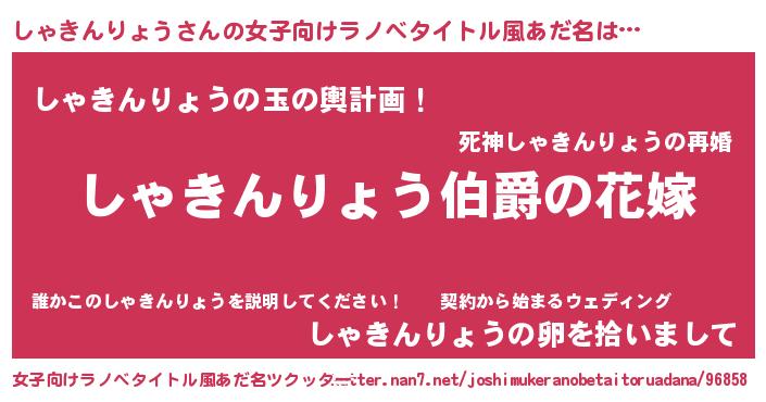 | 男性向けラノベタイトル風あだ名 | 『やはりしゃきんりょうの青春ラブコメはまちがっている 』 |