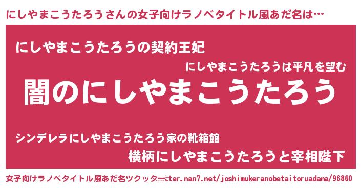| 男性向けラノベタイトル風あだ名 | 『Re:にしやまこうたろうから始める異世界生活』 |