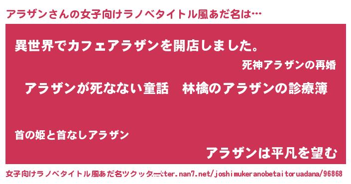 | 意味不明あだ名 | 『住所不定無職アラザン(12歳)』 |