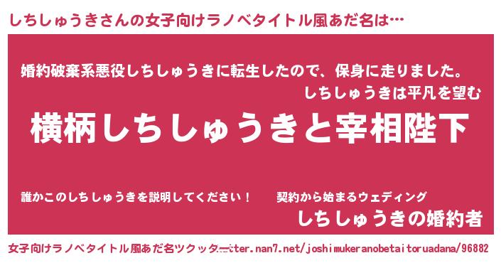 | 男性向けラノベタイトル風あだ名 | 『しちしゅうきに滅ぼされるだけの簡単なお仕事です』 |