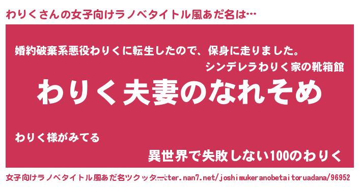 | 男性向けラノベタイトル風あだ名 | 『おまえをオタクにしてやるから、俺をわりくにしてくれ! 』 |