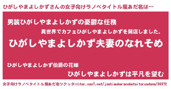 | 男性向けラノベタイトル風あだ名 | 『おまえをオタクにしてやるから、俺をひがしやまよしかずにしてくれ! 』 |
