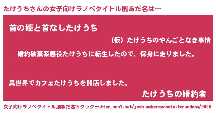 | 男性向けラノベタイトル風あだ名 | 『タケウチスレイヤー』『たけうちの憂鬱』 |