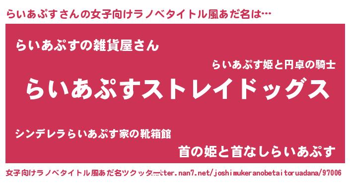 らいあぷすさんの女子向けラノベタイトル風あだ名は… 『らいあぷすストレイドッグス』『らいあぷすの雑貨屋さん』『首の姫と首なしらいあぷす』 ツクッター #女子向けラノベタイトル風あだ名ツクッター http://tkutter.nan7.net/joshimukeranobetaitoruadana/97006/