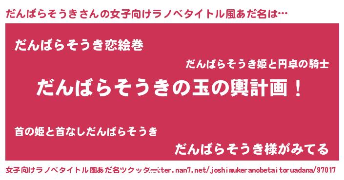 | 男性向けラノベタイトル風あだ名 | 『だんばらそうき~年齢イコール彼女いない歴の魔法使い~』 |
