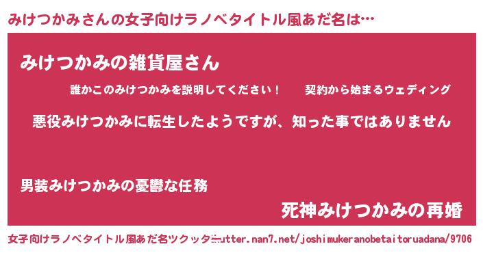 | 胡散臭い通販商品みたいなあだ名 | 『あなたにだけ特別に提供する100年もののヴィンテージワイン…その名も「みけつかみ」』 |