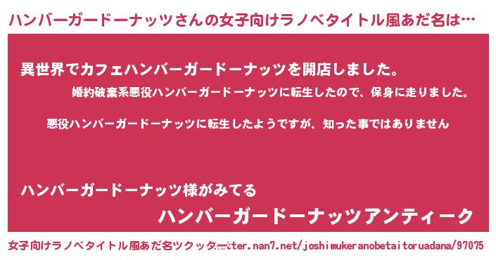 | 男性向けラノベタイトル風あだ名 | 『この素晴らしい世界にハンバーガードーナッツを!』 |