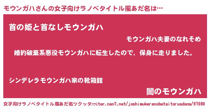 | 男性向けラノベタイトル風あだ名 | 『転生したらモウンガハだった件』 |