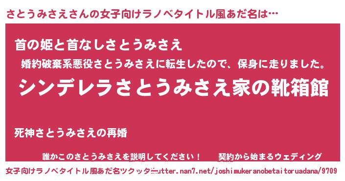 | 男性向けラノベタイトル風あだ名 | 『冴えないさとうみさえの育てかた』 |