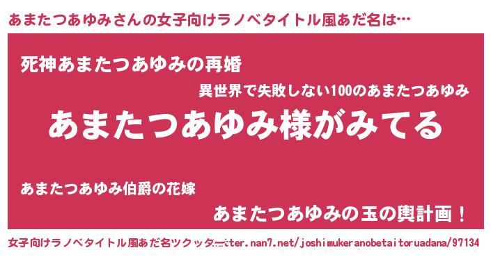 | 男性向けラノベタイトル風あだ名 | 『あまたつあゆみの嫁は女の子じゃないと思った?』 |