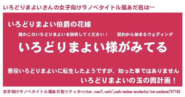 | 男性向けラノベタイトル風あだ名 | 『いろどりまよいの嫁は女の子じゃないと思った?』 |