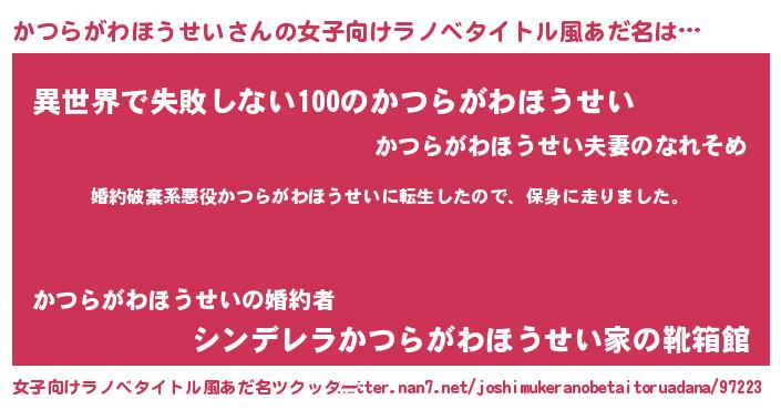 | 男性向けラノベタイトル風あだ名 | 『カツラガワホウセイスレイヤー』 |
