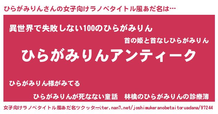 ひらがみりんさんの女子向けラノベタイトル風あだ名は… 『ひらがみりんアンティーク』『異世界で失敗しない100のひらがみりん』『ひらがみりんが死なない童話 林檎のひらがみりんの診療簿』 ツクッター #女子向けラノベタイトル風あだ名ツクッター http://tkutter.nan7.net/joshimukeranobetaitoruadana/97244/
