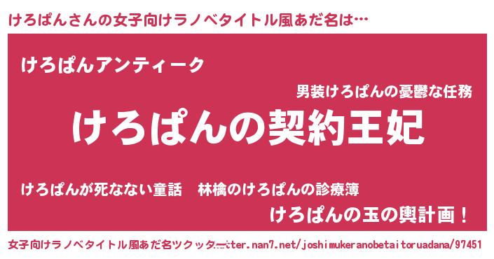 | 男性向けラノベタイトル風あだ名 | 『けろぱんという概念が存在しない退屈な世界 』 |