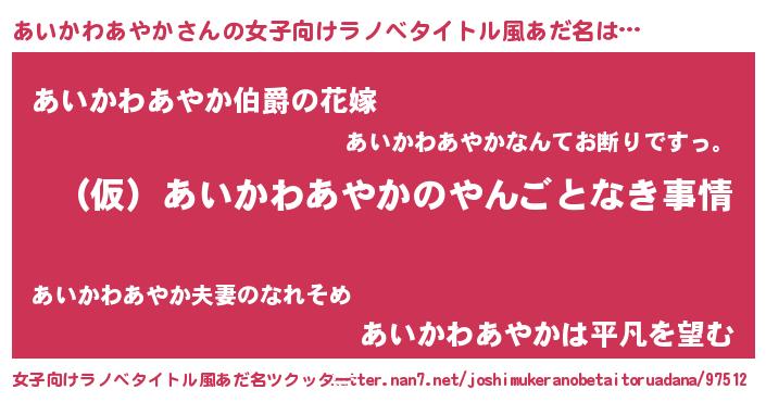 | 男性向けラノベタイトル風あだ名 | 『あいかわあやかの憂鬱』 |