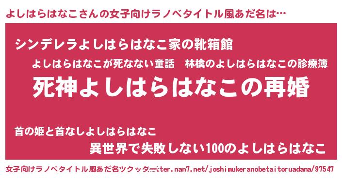 | 男性向けラノベタイトル風あだ名 | 『ノーゲーム・ノーヨシハラハナコ』 |