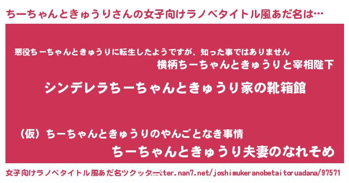 | 意味不明あだ名 | 『住所不定無職ちーちゃんときゅうり(8歳)』 |