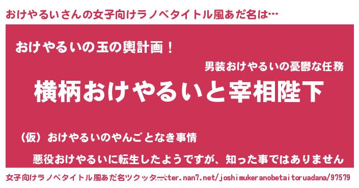 | 男性向けラノベタイトル風あだ名 | 『おけやるいに滅ぼされるだけの簡単なお仕事です』 |