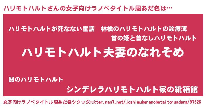 | 男性向けラノベタイトル風あだ名 | 『おまえをオタクにしてやるから、俺をハリモトハルトにしてくれ! 』 |